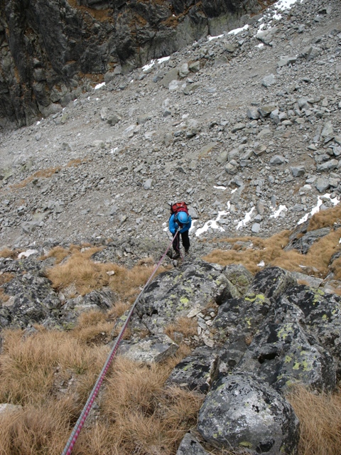 Tento krát sme si s Julkou vybrali chladnú a tienistú stranu V.T. Žltú stenu. Pôvodne som toho roku chcel na nej absolvovať aj iné výstupy, ale povinnosti nepustili, tak na záver sezóny nám vyšla aspoň táto cestička, lepšia asi na zimu. Deň sa nám vydaril napriek nie ideálnym podmienkam, lezenie však bolo o to zaujímavejšie. Po vylezení cesty na vrchol Žltej steny sme už nešli, vyššie v žľabe bolo veľa snehu, zo severu by ho bolo ešte viacej, aj rezervu do tmy sme si nechali. Zlanili sme na juh.